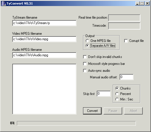 | Abort | Stops conversion, writes the appropriate MPEG end code to the file and closes all files.